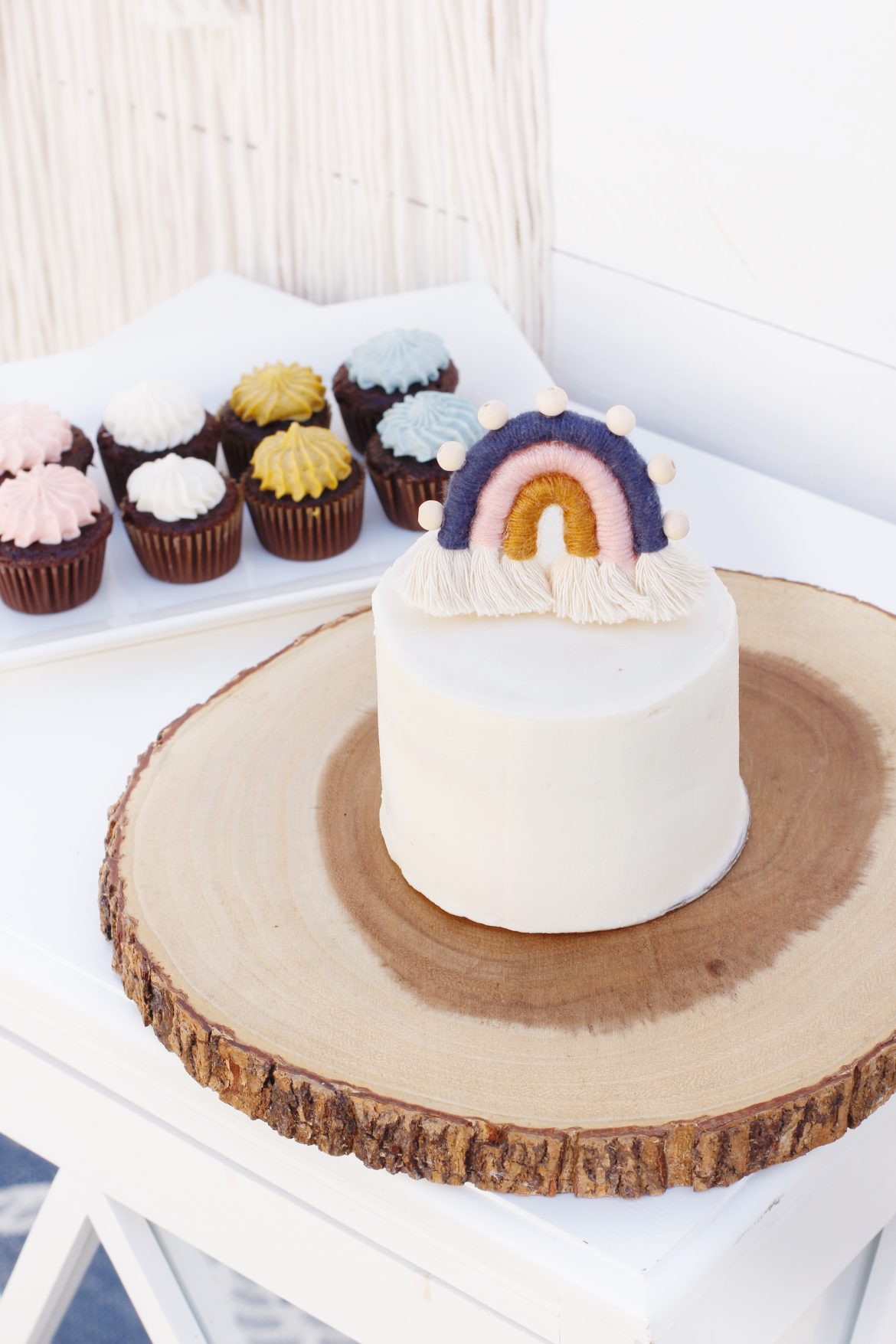 Not surprisingly, there were so many amazing directions you can take a boho rainbow cake. Endless actually. I honestly had a hard time deciding, but ended up going with simple. I created the cake toppers myself using macrame rope, wire, yarn and wood beads…..which means of course there will be a DIY Macramé Rainbow tutorial coming soon!