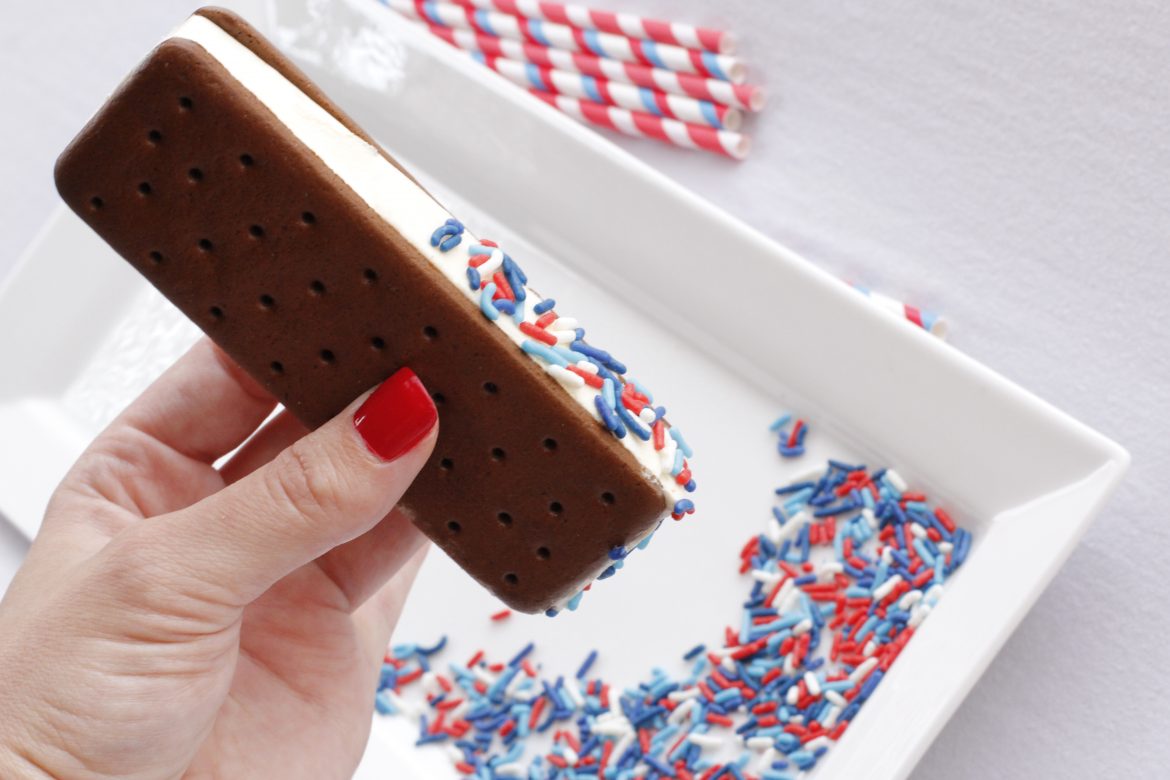 Ready for the world’s easiest 4th of July Dessert – it’s Patriotic Ice Cream Sandwiches! Add red, white and blue sprinkles of ANY kind to your ice cream sandwich bars and that’s it. No I’m not kidding. It’s that simple.