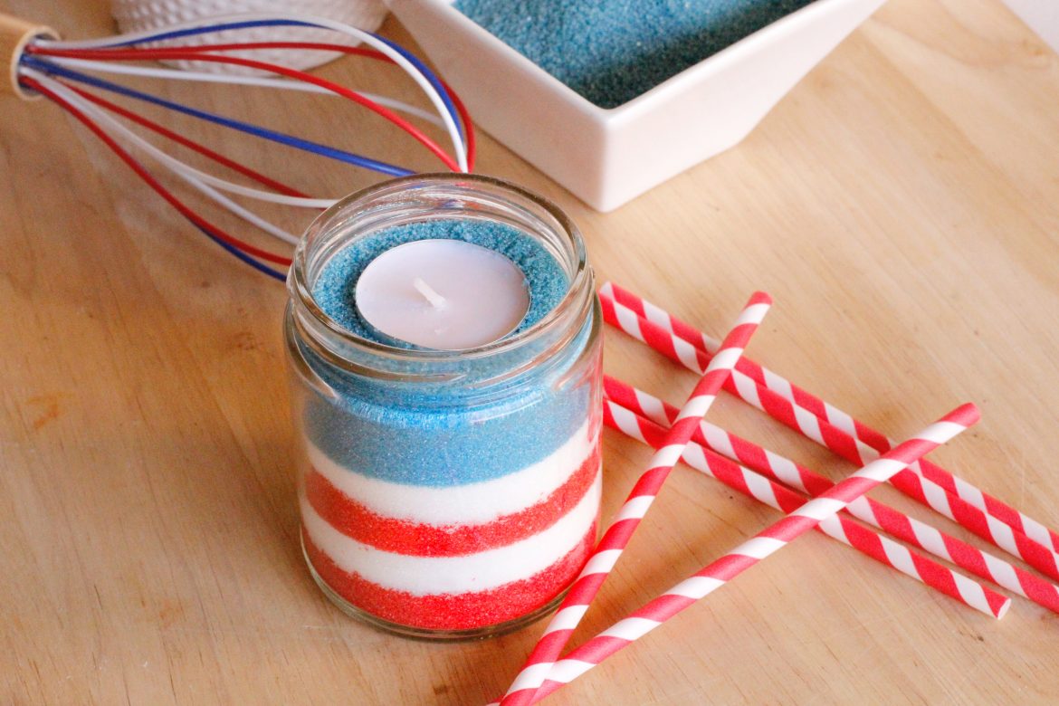 Take a look at these cute Patriotic Sugar Candles. What’s great about this 4th of July Craft is you most likely have everything you need right there at home! Although craft sand can be used, I wanted to give an alternative that saves you money and a trip to the craft store. Sugar, food dye and glass container is all you’ll need!